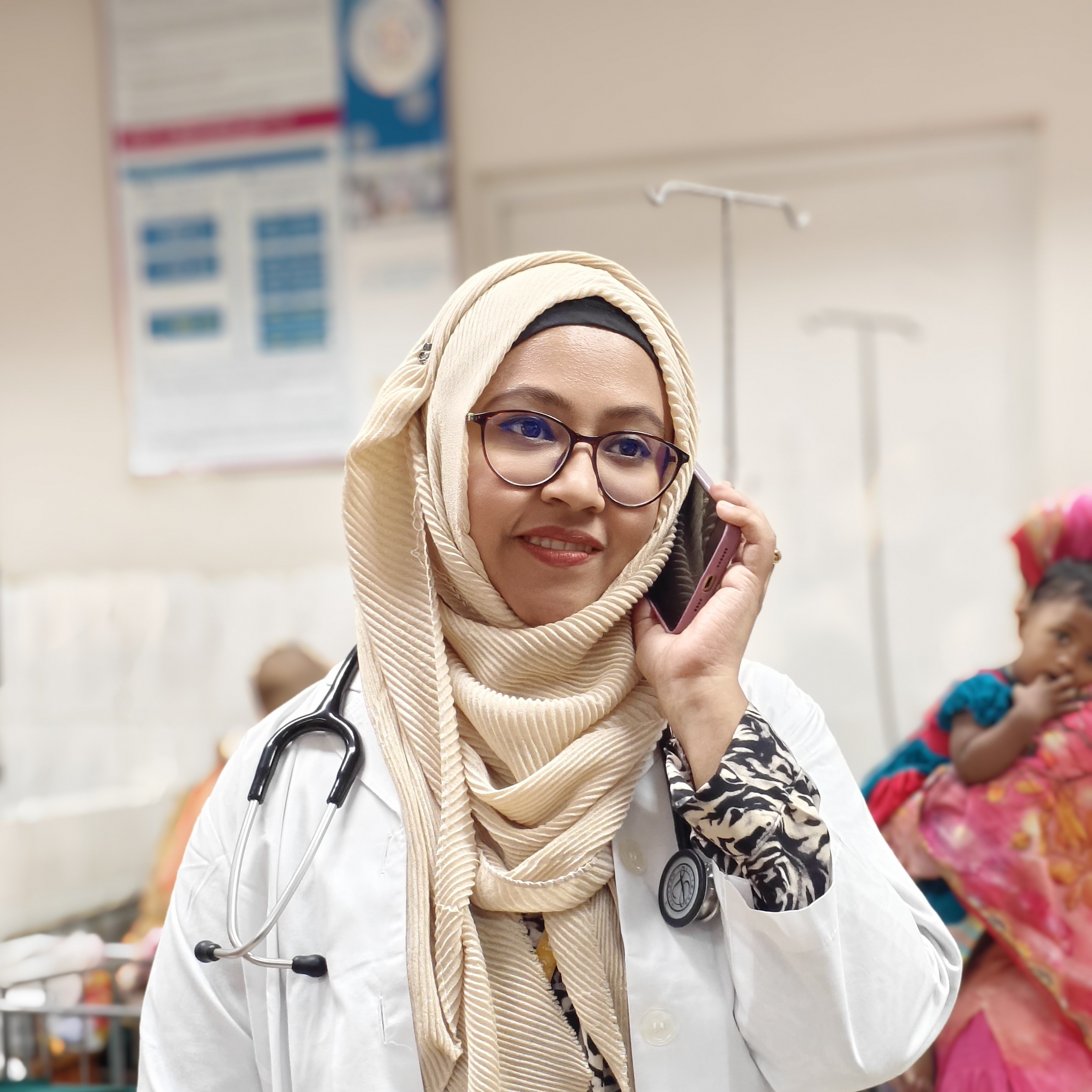 Dr. Chobi at the healthcare facility demonstrating mobile messages.