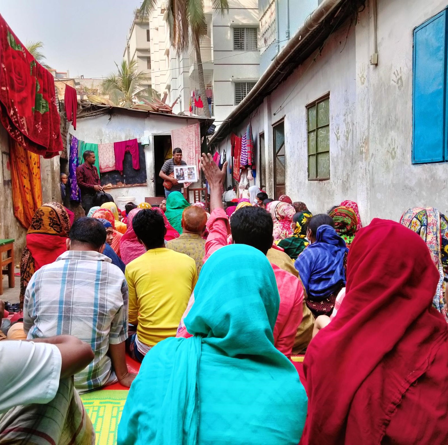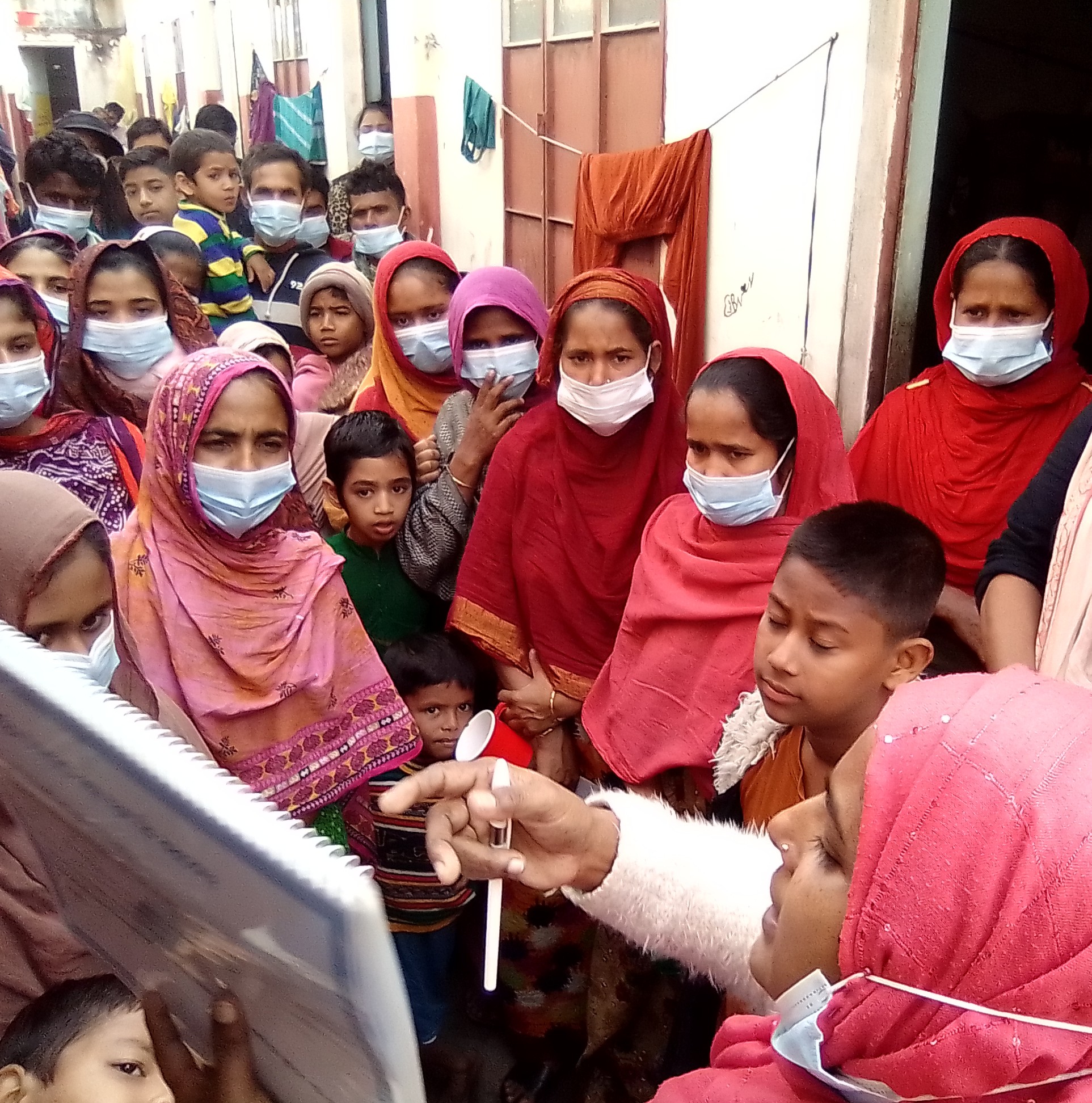 Cholera patient family members and neighbors listen to a CHoBI7 health promoter.
